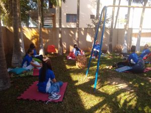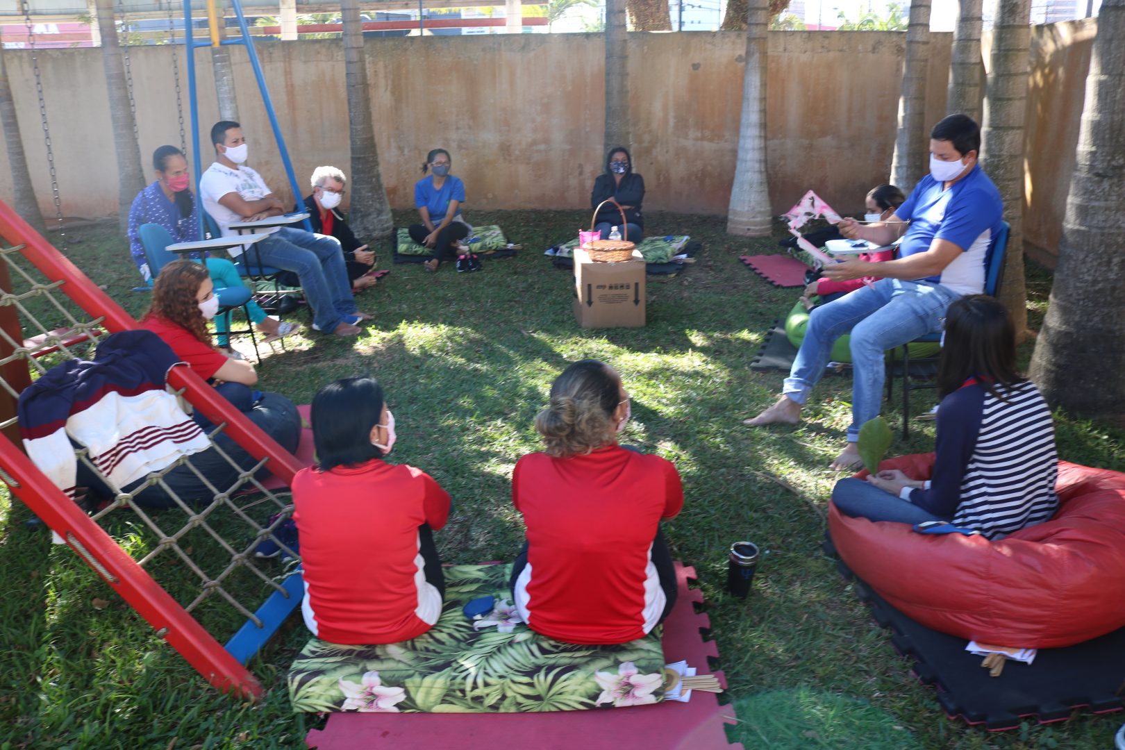 Sentados à sombra das árvores do parquinho e mediados pelos psicólogos, os participantes iniciaram com um momento introspectivo, de forma a manter um clima de paz e tranquilidade durante o encontro. Em um segundo momento, partilharam o que estão sentindo, durante esta fase de pandemia, sobre diversos temas, como relações familiares, relação com Deus, espiritualidade, disposição, alimentação, lazer, dentre outros.